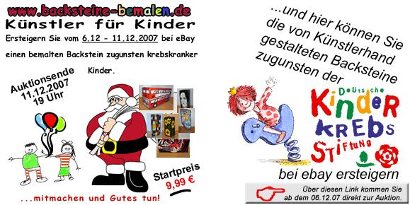 Via der Webseite http://www.backsteine-bemalen.de - Untertitel Künstler für Kinder - suchte Daniela Cordes seit Januar 2007 Künstlerinnen und Künstler, die kostenlos einen Backstein bemalen, der dann ab 06.12.2007 zugunsten der Kinderkrebsstiftung bei eBay versteigert wird. 100 Backsteine von 100 teilnehmenden Künstlerinnen und Künstlern sind nun zugesagt. Auszug aus:prcenter.de