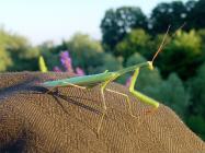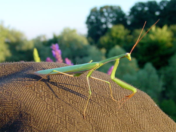 hat sich eine Gottesanbeterin auf seiner Mütze nieder gelassen.