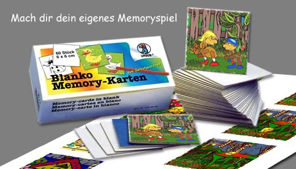 Hier kannst du dir Memoryspiele von Mechthild, Karl & Co. selber machen. Drucke dir dazu die Bildvorlagen einfach 2x aus. Dann schneidest du die kleinen Bilder aus und klebst sie auf einen festen Karton von der gleichen Größe. Fertig ist dein eigenes Memoryspiel. Und wenn du keinen festen Karton hast... Bei dem Versandhandel für Künstlerbedarf Gerstaecker gibt es Blanko-Memory-Karten. In der Packung sind 60 Stück und kosten 2,99 Euro* (*Stand: 15.02.2010)