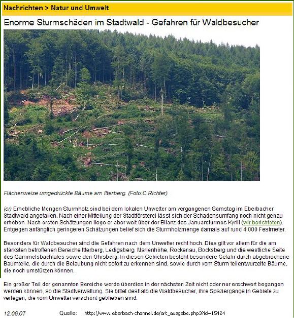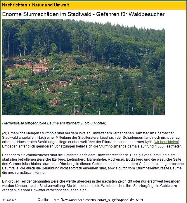 Viele Eberbacher werden sich jedoch noch an diesen einen Tag erinnern... es war ein Samstag. Samstag, der 12. Juni 2007. Ein heftiges lokales Unwetter brach über Eberbach herein und richtete erhebliche Sturmschäden im Stadtwald und Umgebung an. Große Baumbestände wurden dabei vernichtet, die bis heute noch nicht vollständig aufgeforstet sind. Auf diesem Gelände entsteht ein neuer Wald. Der EBERBACHER KUNSTWALD!