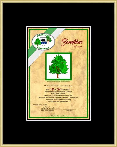 Auf Wunsch können Sie von mir kostenlos ein persönliches Zertifikat Ihrer Patenschaft als PDF-Dokument erhalten. Füllen Sie dazu bitte unten stehendes Formular aus.