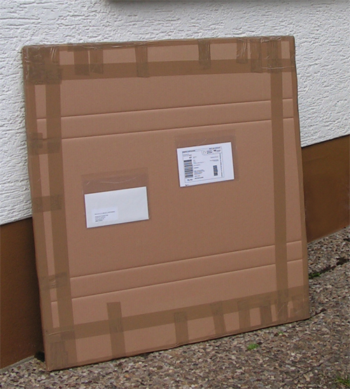 100 x 100 cm - Das Verpacken war schwieriger als ich dachte. Pappe und Kartons habe ich genug. Aber soooo groß...?Mit ausreichend Klebeband konnte dann aber doch eine Lösung gefunden werden :-) Weiteres folgt...