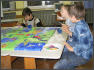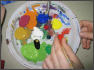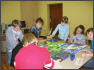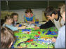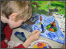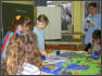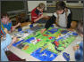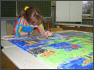 Zuerst wurde wieder großflächig gearbeitet, wobei ich mir schon 2 Künstler für die Knibbeldinger herausgepickt hatte. Nachdem die großen Flächen alle ausgefüllt waren, gingen die ersten Kinder wieder in den Unterricht und es arbeiteten nur noch 2 an dem Werk und den letzten Schliff gab dann nur noch eine Künstlerin mit einer vorbildlichen Ausdauer. Diese war aber schon acryl- und leinwanderfahren und brachte sogar zwei eigene Farbtöne mit.