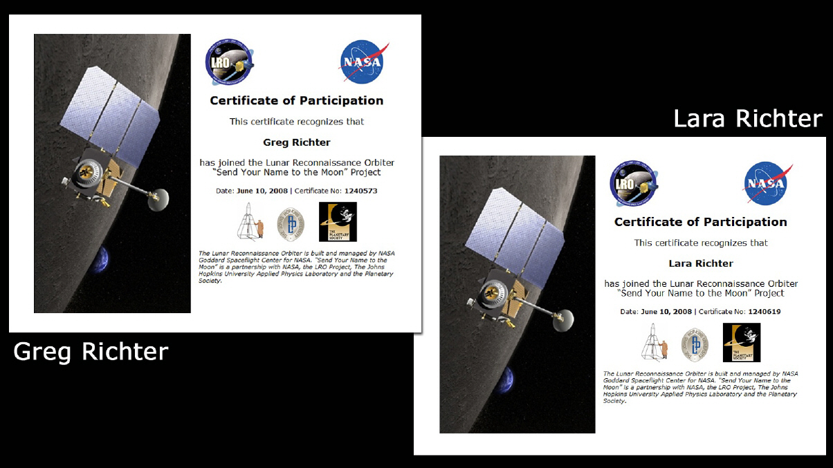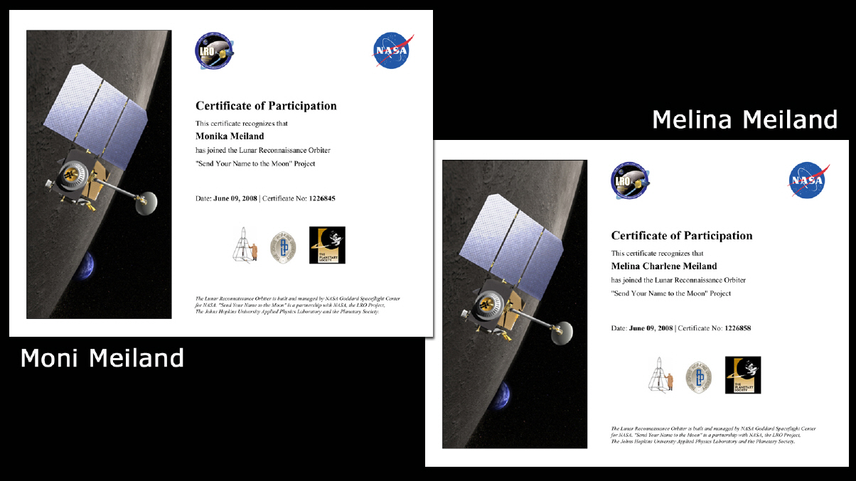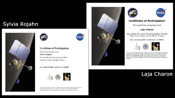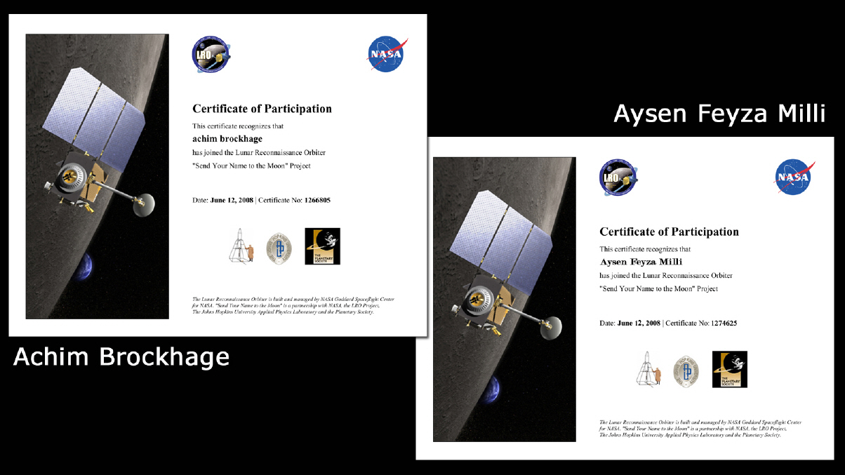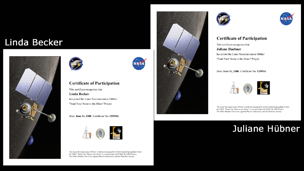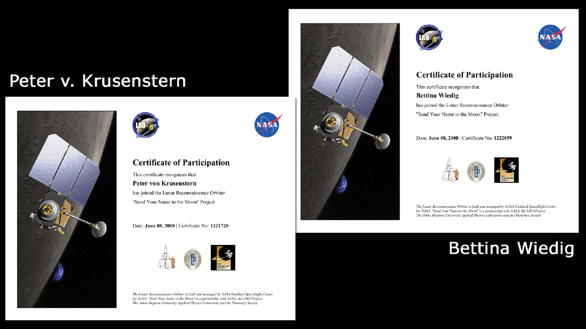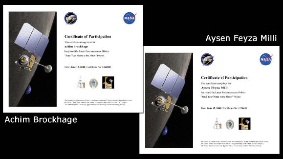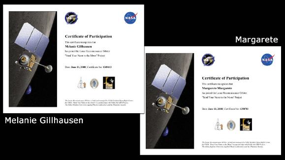 Hurra! End of the year 2008 we fly to the moon with the LRO! OK, not personally. But our names do fly with. At the end of the year 2008 NASA sends the Lunar Reconnaissance Orbiter (LRO) to the moon. The list of names will be stored on a microchip and taken on board of LRO. Till the 27 of June each interested person can insert its name into this list which flies with LRO to the moon.