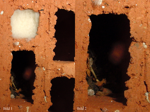 Alles fing wirklich ganz harmlos an. Eines Tages bekam ich eine sms mit der Frage: "Kennst du ein Insektenhotel?" Nein, kannte ich natürlich nicht. Aber seit in meinem Garten ein Insektenhotel steht, habe ich viel dazu gelernt. Oft gab es Dinge, die ich mir nicht erklären konnte ... die ich gar nicht zu deuten wusste. Oft lag ich mit meinen Vermutungen völlig falsch... Hat hier eine Spinne ihr "Unwesen" getrieben? Oder können Sie sich erklären, was das zugesponnene Loch im Backstein bedeutet?