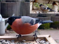 Viele rote Flecken sitzen in den Obstbäumen. Es ist der Gimpel (auch Dompfaff genannt). Die Weibchen hingegen wirken von der Farbgebung fast ein bisschen unscheinbar. Das Gimpelmännchen macht keinen Unterschied zwischen Futter auf der Fensterbank oder im Garten. Die Weibchen hingegen ziehen das Vogelhäuschen im Garten vor. Es ist schon interessant, wie jeder so seine eigenen Vorlieben hat…