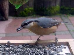Der Kleiber ist ein witziges Kerlchen. Er kommt, sammelt 5 bis 6 Sonnenblumenkerne in seinem Schnabel, verschwindet mit seiner Beute für eine ganz kurze Zeit und wiederholt diesen Vorgang unzählige male. Es ist schon mehrmals vorgekommen, dass er innerhalb eines Vormittags die gesamte Futterstelle leer geräumt hat. Irgendwo muss er sich einen Vorrat anlegen… Übrigens, der Kleiber ist der einzige Vogel, der kopfüber einen Baum hinunter laufen kann.