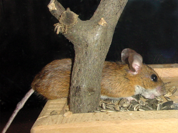 Dieser kleine Nager ist eine Gelbhalsmaus. Sie ist nachtaktiv und ein sehr guter Kletterer… manchmal bis in die Spitzen der Bäume. Für den Winter wird ein Vorrat aus Körnern, Eicheln und Buchäckern angelegt.