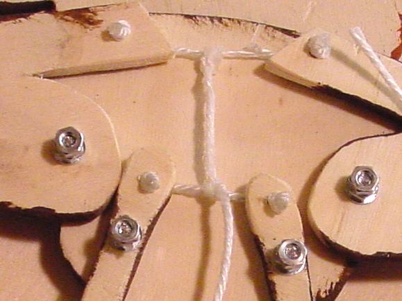 Danach knotest du an diese beiden Schnüre eine eine ca. 30cm lange Schnur (wie auf dem Bild). Lass diese Schnur unten raushängen. Daran musst du dann ziehen, damit Pipistrello zappeln kann.