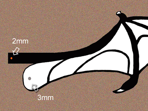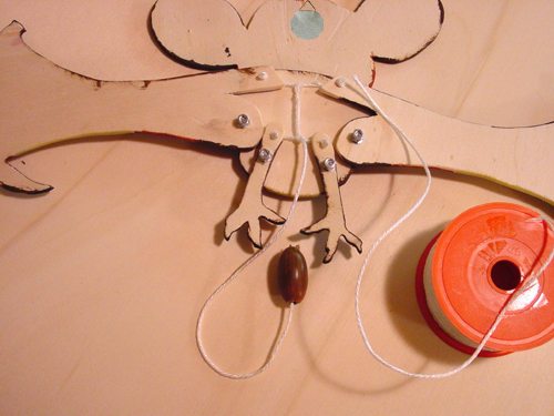 Verkote den linken Flügel mit dem rechten Flügel und das linke Bein mit dem rechten Bein. Danach knotest du an diese beiden Schnüre eine ca. 30 cm lange Schnur (wie auf dem Bild). Lass diese Schnur unten raushängen. Dann musst du daran ziehen, damit Pipistrello zappeln kann. >>hier findest du noch mal eine ganz große Abbildung. ...und klebe noch den Bildaufhänger an Pipistrellos Kopf.