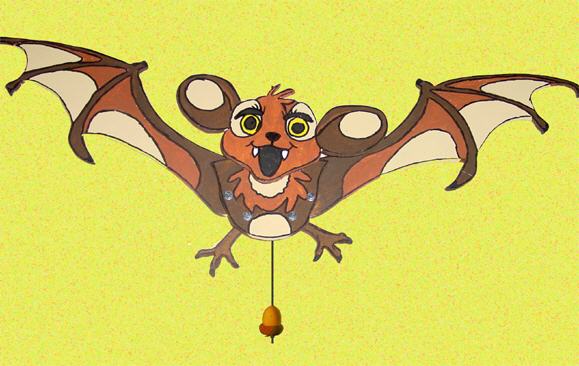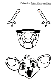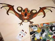 Nachdem du Pipistrellos Körperteile angemalt hast, klebst du mit Holzleim den Kopf auf ihren Körper. Wenn der Kleber getrocknet ist, verbindest du die Beine und Flügel (Hände) mit ihrem Körper. Dafür verwendest du die 3 mm Schrauben. Ziehe die Muttern nicht zu fest an, sonst lassen sich die Beine und Flügel nicht mehr bewegen.