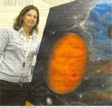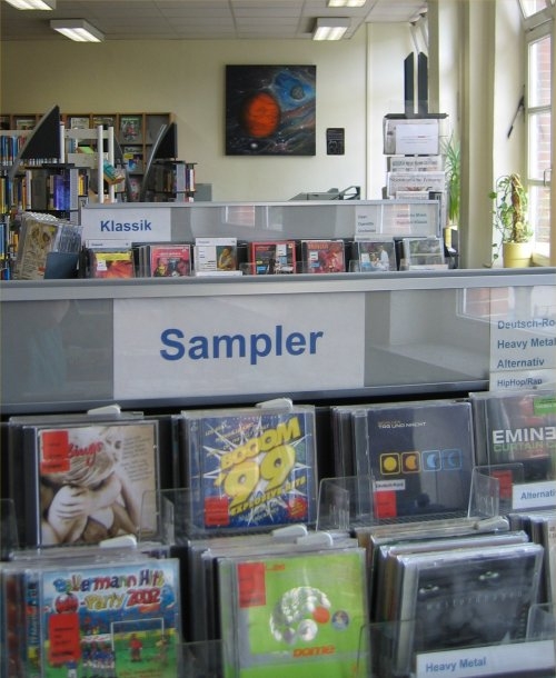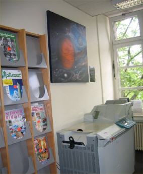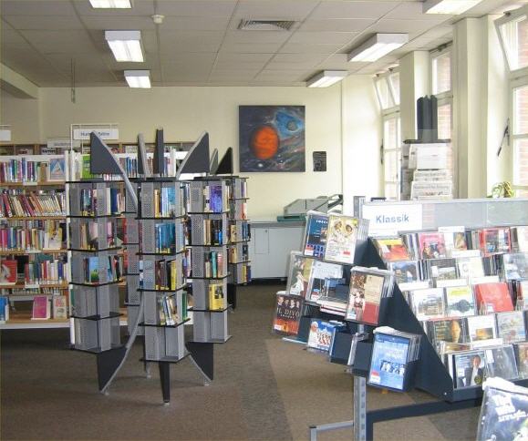 MARS REGIERT zwar nicht gerade die Stadtbibliothek, aber der „Rote Planet", den Bibliothekarin Anja Merz hier hält, ist vier Monate lang im Bert-Brecht-Haus zu sehen. Der Künstler Hubertus Wobbermin schuf mit Mars einen Teil des Projekts „Planeten in Deutschland". Darin geht es um die maßstäbliche Verdeutlichung der Entfernung der Planeten innerhalb des kosmischen Systems - die Sonne hängt gerade in Recklinghausen. Quelle: www.bibliothek.oberhausen.de