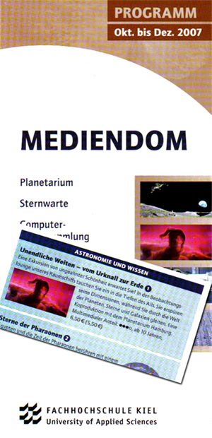 Ein 600 km großes Kunstwerk "bewegt sich" durch Deutschland. Elf Künstler beschäftigten sich mit unserem Sonnensystem und malten ein Gemälde "ihres" Planeten. Der "Neptun" wurde von Lucia Poleratzki, der jüngsten Teilnehmerin geschaffen und hat bis zum Jahresende sein Zuhause im Mediendom der Fachhochschule Kiel gefunden. Wie sein Namensgeber wird das Gemälde im kommenden Jahr mehrfach seine Position wechseln und die Sonne umrunden, die in Recklinghausen positioniert ist.