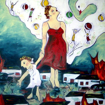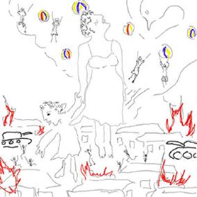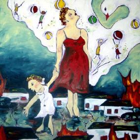 Die Mutter erhebt sich zur Friedenstaube um ihr Kind vor dem Bösen zu retten - in eine Ebene, in der alle Nationen ohne Krieg in Frieden zusammen leben können.