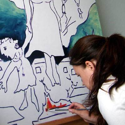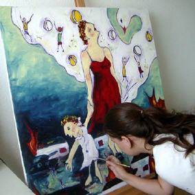 Das Mädchen streckt den Arm und reicht den unten gebliebenen Menschen die Hand - als Aufforderung nicht die Hoffnung zu verlieren und sie auf ihrer Reise zu begleiten.