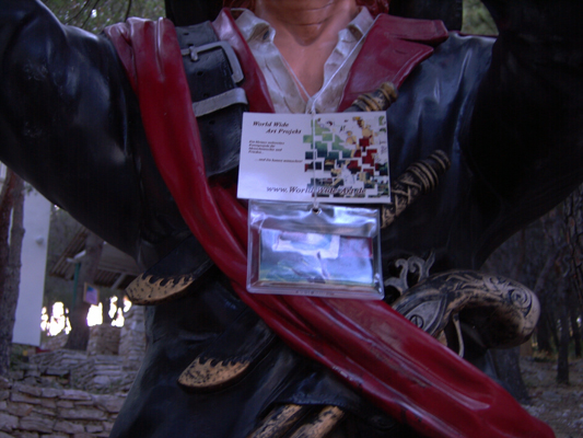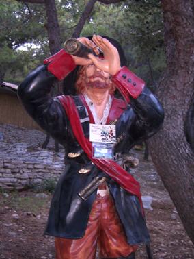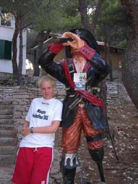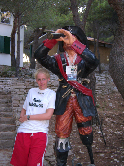 Der Pirat steht am Hauptweg der Insel, symbolisch für die "Pirates of young Island", die deutschen jugendlichen, auf der kroatischen Insel. Bis zum Ende der Saison bleibt das Bild am Hals des Guten. Später wird es über Winter mit aufs Festland genommen, ins Haus einer Rezeptionsangestellten, die mit ihrem Mann nach Kroatien gezogen ist und das ganze Zusammenleben auf der Insel mitorganisiert. Sie möchte das Bildteil entweder nächstes Jahr wieder mit auf die Insel bringen, oder es in dem kleinen Städtchen (den Namen habe ich auch noch irgendwo, aber jetzt gerade nicht zur Hand ;) ) ins Rathaus hängen lassen. Sie hat mir ihre Adresse gegeben, damit ich mich bei Rückfragen an sie wenden kann. Habe ihr natürlich von dem ganzen Projekt erzählt und sie war ziemlich beeindruckt, so etwas auf die Beine zu bekommen. Also ein dickes Lob an Euch. Lucia Bergkamen-Rünthe im Juli 2006