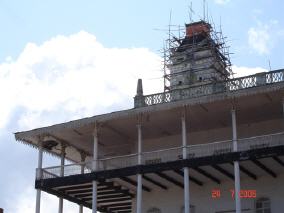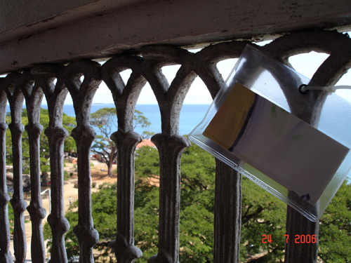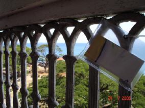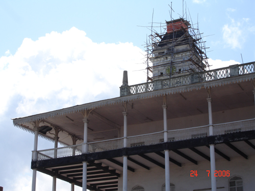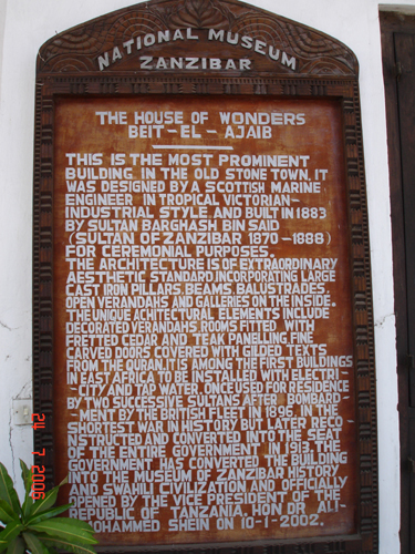 Zanzibar -bedeutet so viel wie "Schön ist diese Insel"- ist die Gewürzinsel Afrikas. Mit seinen großen historischen Schätzen aus der Vergangenheit, seinen charakteristischen Landschaften und den unvergleichlichen Korallenstränden ist es die Perle des Indischen Ozeans - vielschichtig und reich an Natur, mit seinen Korallenriffen und einem großen Kulturerbe. Die wichtigste Attraktion von Zanzibar Town ist die historische Altstadt. Vor über 300 Jahren begannen die Araber, hier Häuser aus Stein zu bauen - eine für Afrikaner eher untypische Bauart. Stonetown, also die »Steinstadt«, verzückt durch ihre scheinbar wild aneinandergereihten Häuser, zwischen denen enge, schattige Gassen (Vichochoros) verlaufen. Durch die dichte, schattenspendende Bauweise sorgten die Araber dafür, dass es in der Stadt immer etwas kühler war als auf dem Land. Sie installierten sozusagen eine flächendeckende Klimaanlage. Das „Haus der Wunder“ ist ein mehrstöckiges Gebäude, das 1883 als Palast für Sultan Barghash erbaut wurde. Seinen Namen verdankt der Palast der Tatsache, dass es das erste Gebäude in Zanzibar mit elektrischem Licht war. Es ist eines der größten Gebäude in Zanzibar. Und hier fand die kleine symbolische Friedensbotschaft Nr. 57 durch Nicola Hedderich ein ehrenvolles Plätzchen. Nicola aus dem Rhein/Main-Gebiet im Juli 2006