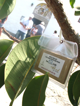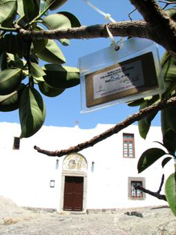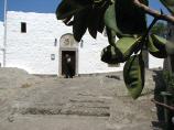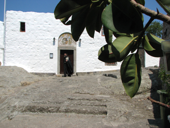 Patmos ist die Insel, auf der Johannes, der Lieblingsschüler Christi in der Verbannung lebte, und die Höhle ist der Ort, wo er die Offenbarung niederschrieb. Heute umgibt das Offenbarungs-Kloster die heilige Höhle. Nach Aufassung der orthodoxen Theologie ist die Offenbarung des Heiligen Johannes der entscheidende Text, der zur Busse und zum Heil führt. Aus diesem Grund wurde er auch in das Neue Testament aufgenommen. Auf den Photos siehst Du im Hintergrund den Eingang zur Höhle. Karin Böhme-BrendelJuli 2006