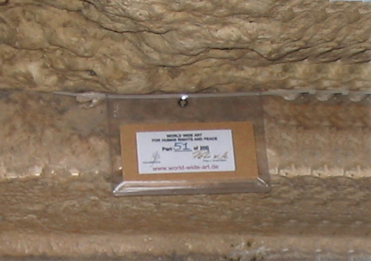 Die Friedensbotschaft Nr. 51 liegt an der Klagemauer Die Klagemauer (515 v. Chr.) ist das bedeu-tendste Heiligtum des Judentums und wird von den Juden "Westliche Mauer" genannt, da sie die Westmauer der Tempelanlage war. Für viele Juden ist sie der symbolische Rest des ungebrochenen Bundes Gottes mit dem jüdischen Volk. Dieser geschichtsträchtige Ort wurde als idealer Platz für die kleine weltweite Friedensbotschaft ausgewählt. Unzählige Gebete stecken in den Steinritzen der Klagemauer.