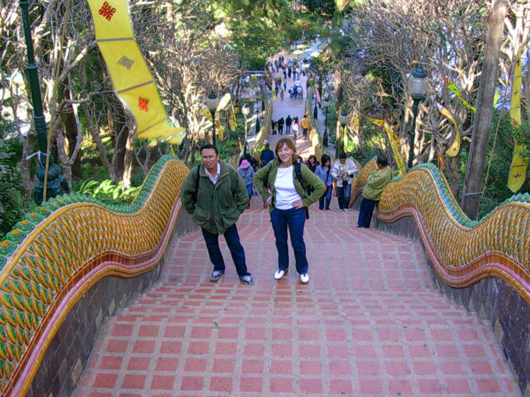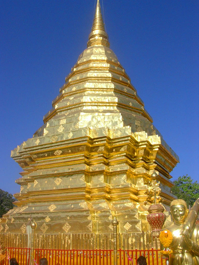 Einige Kilometer außerhalb der Stadt liegt der Wat Doi Suthep , der sich 1600 m hoch über der Stadt erhebt. Eine mit Naga, Schlangen verzierte Treppe mit 300 Stufen führt zum Gipfel von dem man einen atemberaubenden Blick auf die Landschaft hat. In der Mitte befindet sich ein goldschimmernder Chedi, dessen Spitze mit einem fünffachen Ehrenschirm verziert ist.