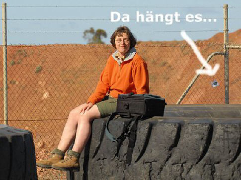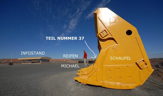 Teil Nummer 37 haben wir ganz rechts am Zaun aufgehängt, weit weg vom offiziellen Infostand der Minengesellschaft. Direkt hinter den zwei ausgedienten Reifen, auf denen sich die Touristen ebenso gerne fotografieren lassen wie in der riesigen gelben Schaufel direkt daneben. Auch wir konnen es natürlich nicht lassen. Und da das Plastik um Teil 37 so schön in der Sonne glänzt, haben in Zukunft viele Leute das gute Stück mit auf dem Bild. Wir hoffen es wird nicht entfernt und bleibt dort noch recht lange im Wind hängen, mit toller Aussicht auf den Tagebau, Action rund um die Uhr und an 365 Tagen Besuch von Leuten aus aller Welt.