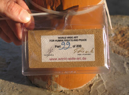 Das Bildteil Nr. 99 ist nun in Kenia angekommen. Nach Beratungen mit unserem einheimischen Guide haben wir ein hoffentlich würdiges Plätzchen gefunden. Wir haben es an einem Aussichtspunkt im Amboseli-Nationalpark mit Blick auf den Kilimanjaro angebracht. Und wir hatten richtig viel Glück, dass der höchste Berg Afrikas zu diesem Anlass sogar aus den Wolken herauskam! Simone Kaiser im Juli 2007