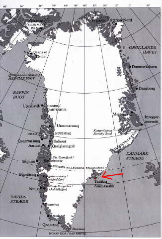 Besiedelt ist die Insel heute von etwa 56.000 Einwohnern, überwiegend Inuit (=Menschen). An der gesamten Ostküste leben davon nur 3500 Menschen, zum größten Teil im Distrikt Ammassalik mit der Haupt“stadt“ Tasiilaq. Hier reicht das gewaltige Inlandeis bis in die Fjorde hinab. Die Küstengebirge ragen bis zu 3700 m aus dem Meer empor. Die meisten Gipfel dieser imposanten Urlandschaft sind bislang unbestiegen. Ackerbau und Viehzucht sind an der Ostküste unmöglich, wo der Birkenpilz die Birke an Größe überragt. Die Jagd bildete Jahrhunderte lang die Lebensgrundlage für die Menschen. Gejagt wird wie ehemals von kleinen Booten und Qajaqs aus, was für die tägliche Ernährung nötig ist. Die Robbe ist ihnen Kartoffel, Brot und Fleisch, sie liefert Kleidung, Baumaterial und Werkzeug. Heute wird sie zum Teil ersetzt durch den Supermarkt, was enorme soziale und kulturelle Probleme mit sich bringt.
