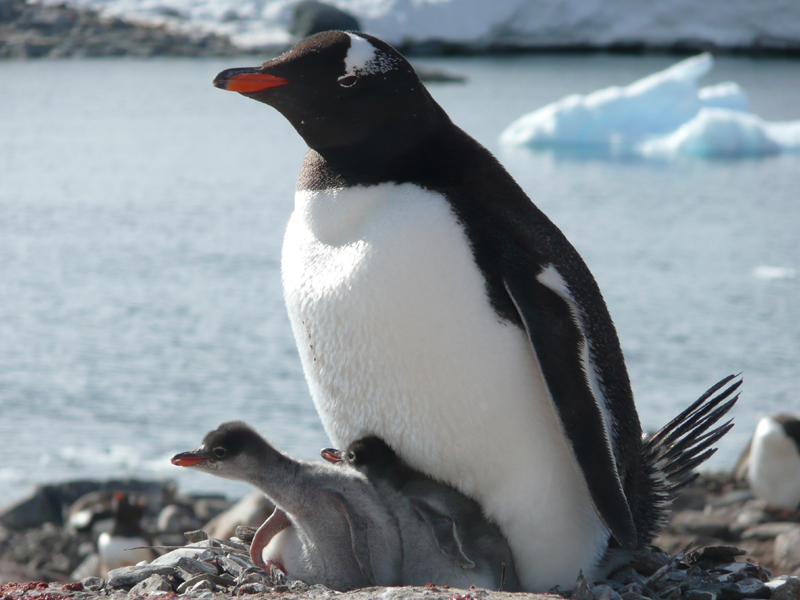 Auch in der Antarktis erwacht ständig neues Leben: Eselspinguin mit neugierigem Nachwuchs.