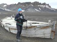 Noch eine Ortsbeschreibung: Deception Island - 62° 59' S und 34' W - gehört zu den Südshetlandinseln. Sie ist ein aus dem antarktischen Meer ragender Vulkanberg, in dessen Caldera (Durchmesser 6,5 km) man mit einem Schiff hineinfahren kann. In einer der Buchten, der Whalers Bay, wurden in der Antarktis erlegte Wahle frabrikmäßig verarbeitet. Hier entstanden auch die Präsentationsfotos des WWA-Projektes. Die letzten Vulkanausbrüche in den 1960-er und 1970-er Jahren zerstörten die Gebäude der Wahlfanggesellschaft. Auf den Bildern ist kaum Schnee zu sehen, da Wärme vom Boden abstrahlt, aus Fumarolen heiße Dämpfe entweichen und Quellen am Strand das Wasser stellenweise auf über 60 ° erhitzen - und das in der sonst kalten Antarktis.