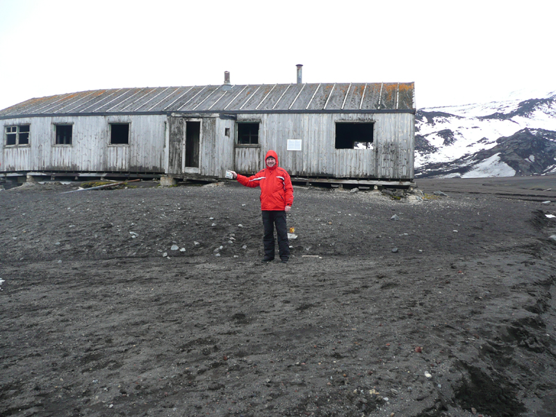 Peter L. präsentiert die Spezial-Friedensbotschaft in der Whalers Bay auf Deception Island vor dem Mannschaftsgebäude der alten Walfangstation.
