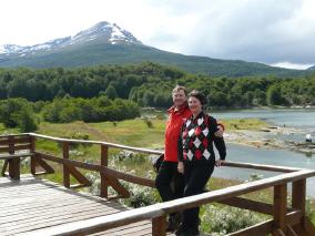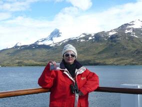 Friedensbotin Irene L. vor der Bergkulisse Südfeuerlands bei der Anreise auf dem Beaglekanal zur argentinischen Stadt Ushuaia am Ende der Welt