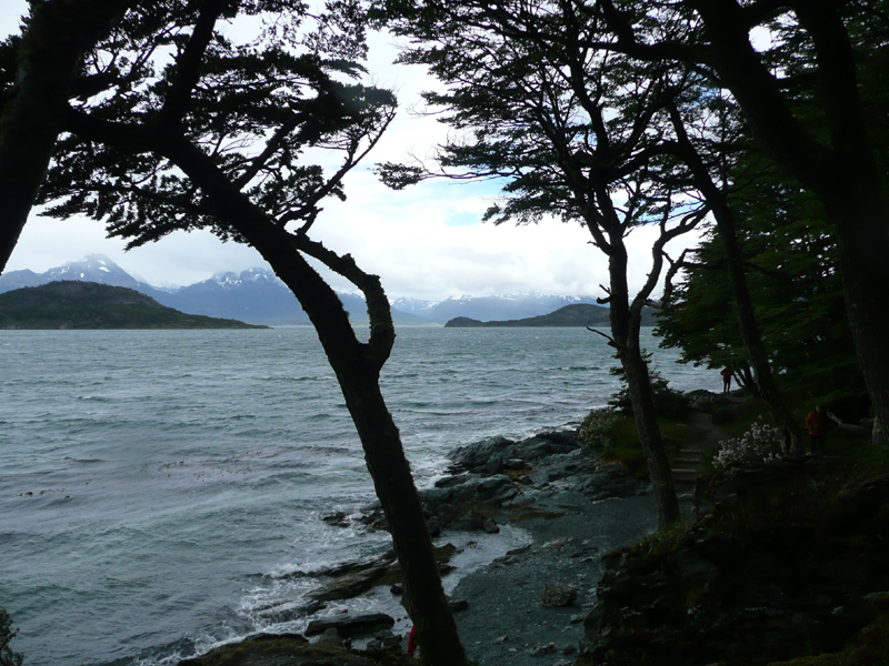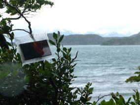 Die schneebedeckten Ausläufer der Anden säumen das argentinische Ushuaia, die südlichste Stadt der Erde am Ende der Welt. Die immergrünen Südbuchenwälder bildeten die Jagdgründe der Yámana und Kaweshkar, die am Beaglekanal und den Küsten Feuerlands als Kanu-Nomaden unterwegs waren. Sie stellten den Robben nach, sammelten Muscheln und fischten in den Fjorden. Die aus der Alten Welt eingetroffenen Siedler bekämpften die Ureinwohner und rotteten sie aus – fast alle!!! Am Ufer ihrer Jagdgründe im heutigen Nationalpark Tierra del Fuego hängte ich als Friedensbotin das Bildteil Nr. 131 am 8. Januar 2008 um 16.50 Uhr an einen Zweig einer jungen Südbuche.