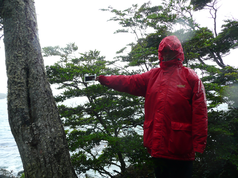 Irene L. präsentiert das Bildteil 131 bei Sturm und Regen am Ufer der Bahia Ensenade, der kleinen Bucht.