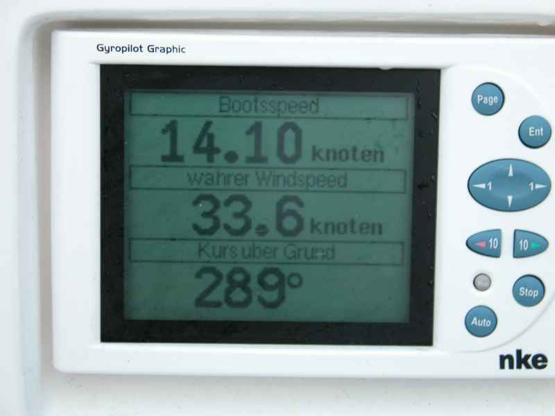Kurs West, 7 Bft., nur 14 Knoten Fahrt ohne Gennaker